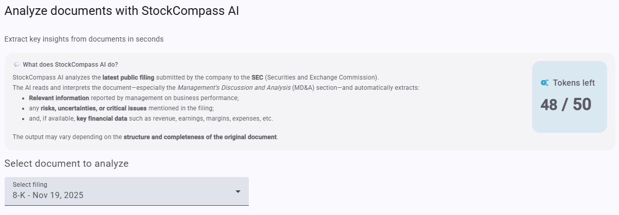 Select a filing and let StockCompass AI do the reading for you: