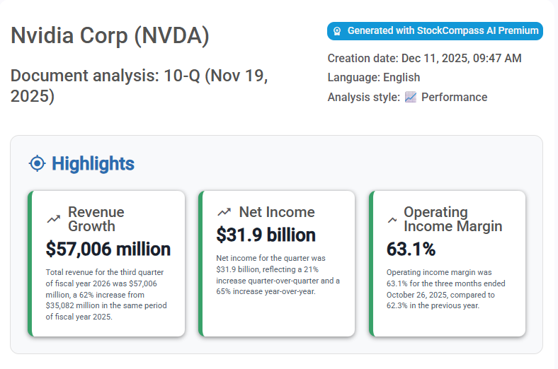 All the figures above come directly from the SEC filing, parsed automatically by StockCompass AI. Instead of manually scanning hundreds of pages, you get clean, structured highlights in seconds.